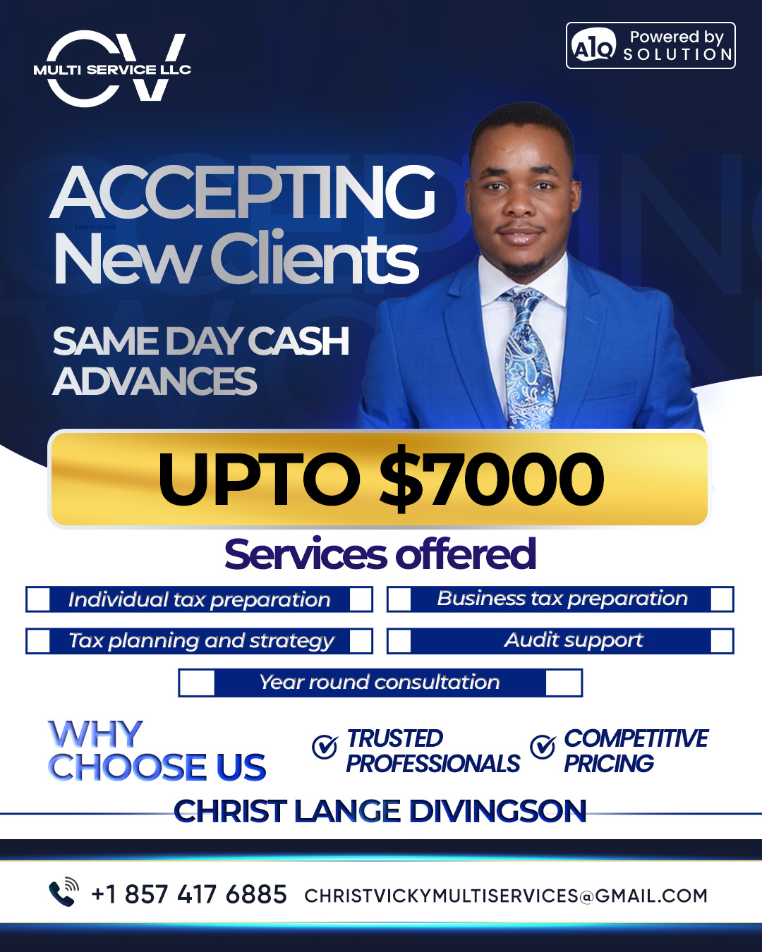 Thank you for choosing Christ Vicky Multiservices LLC for your tax filing needs! We’re excited to serve you. Please complete the intake form as thoroughly as possible. If you have any questions or need assistance, feel free to email us at [email protected] or call +1 857 4176 885.
